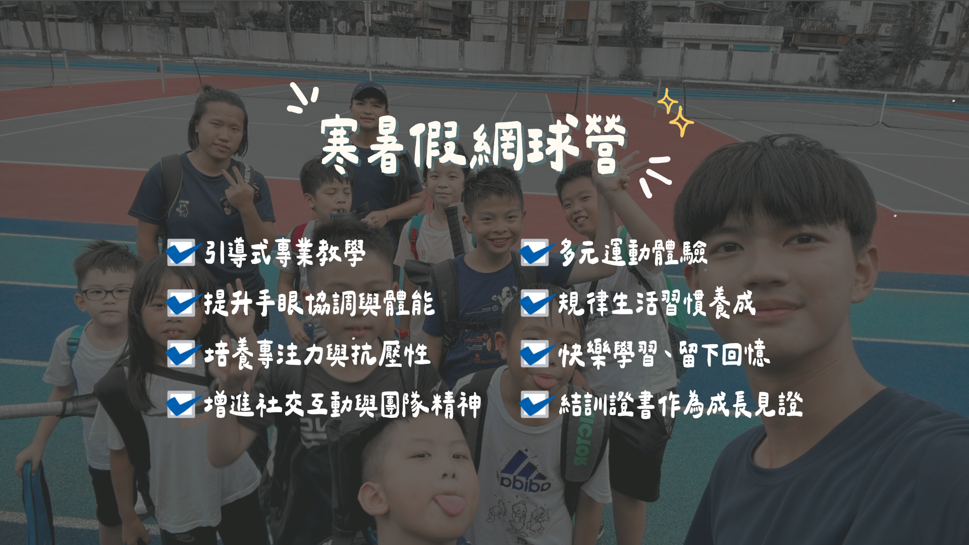 被家長們譽為『行為矯正營隊』的熊WIN假期營隊,除了學習網球的專業技巧、加強身體協調能力,更能夠在營隊當中學習到不同的多元運動項目 如果您不想讓孩子假期當中一整天都在家裡滑手機吹冷氣,想找一個地方讓他們能夠曬曬太陽、學習運動技巧,多吃蔬菜、養成午睡習慣等等 熊WIN營隊就是您的最佳選擇!